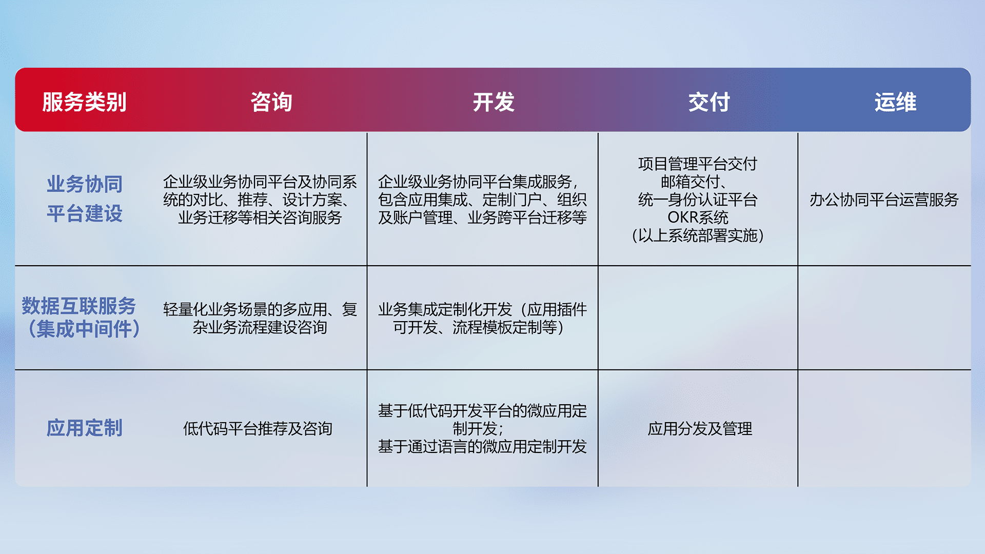 针对钉钉、、、企微、、IDaas等平台级产品提供产品的规划、、方案、、交付、、、、定制化开发等服务,,实现如统一协同办公、、、、智能客户服务、、混合会议管理、、、智能数据查询、、等业务场景,,,实现数字化转型。。